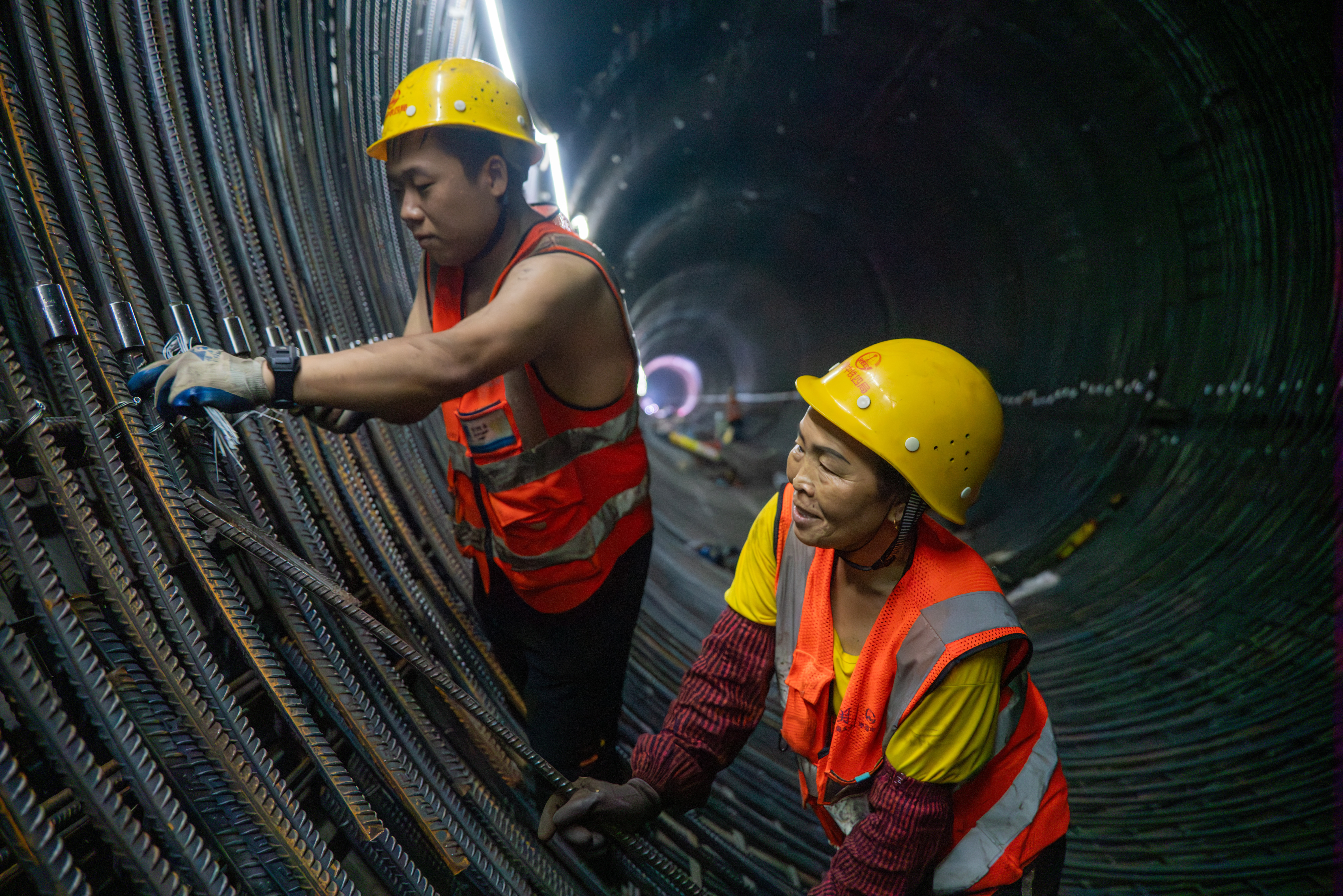 工东谈主正在进行内衬钢筋绑扎工序功课